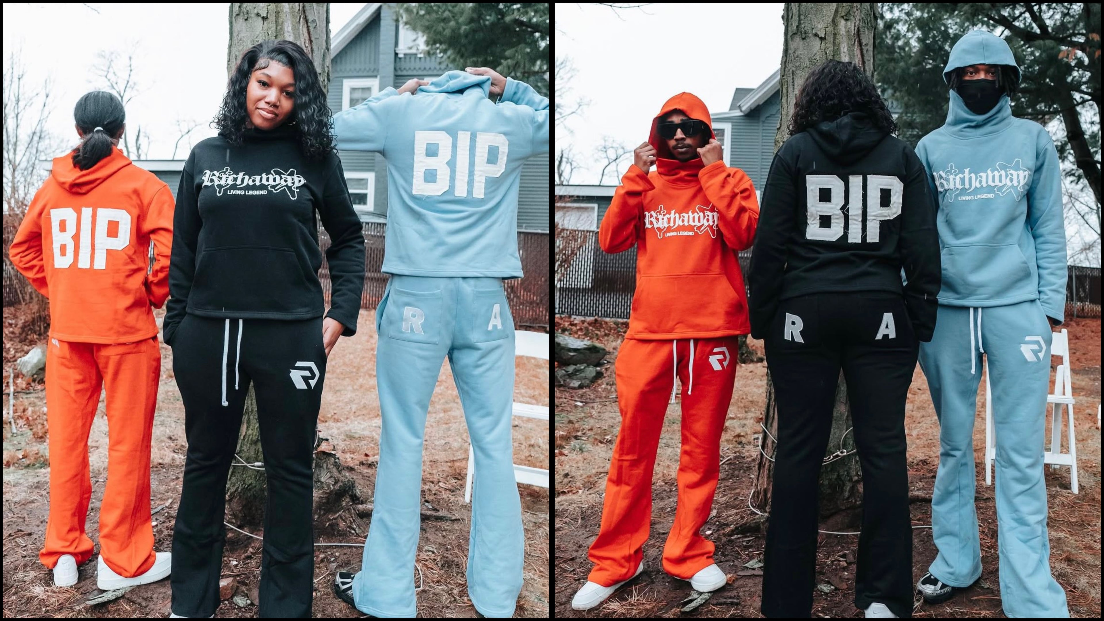 "BIP" pullover sweatsuits featuring our signature eyelets on the hoodie and sweatpants.